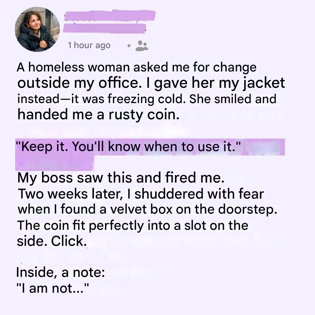 She was sitting right in front of the glass doors of our building, her back against the cold marble, as if the stone could somehow steal a little less heat from her. The wind swept across the avenue, and I clutched my scarf, searching my pockets. Nothing. Not a single coin.