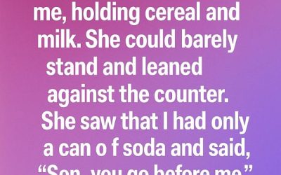 An elderly woman—well into her eighties—stood in line ahead of me, clutching a small box of cereal and a carton…