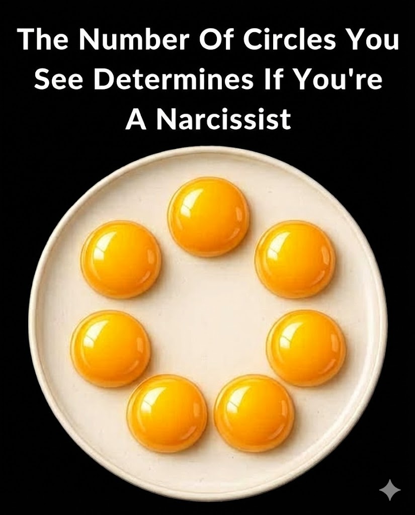 At first look, the image seems harmless: a clean plate, seven glossy egg yolks arranged in an almost perfect ring, and a bold headline claiming that the number of circles you see can determine whether you’re a narcissist.